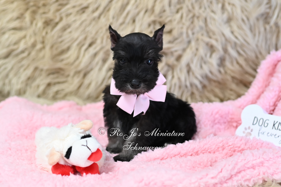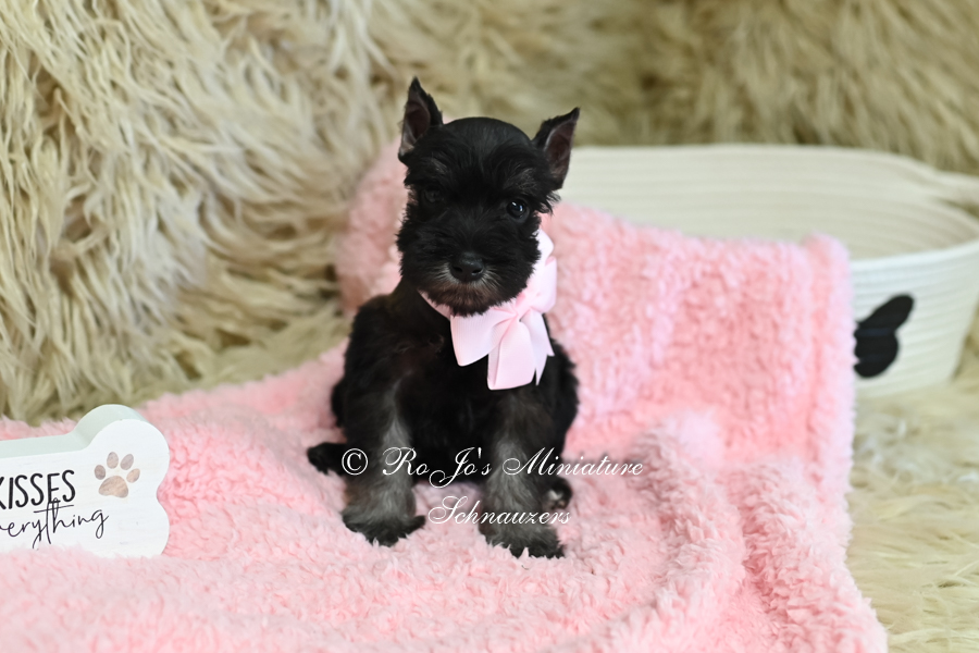 Black & Silver Mini Schnauzer | Roxie Color: Black & Silver Gender: Female Date of Birth: 8/4/2025 Sire: Rowdy Boy Dam: Ellie Mae Price: $2000