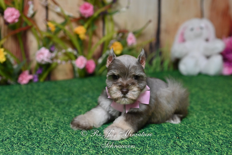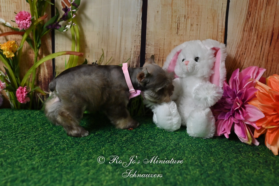 Meet Lil Miss Lizzie! She is gorgeous liver pepper miniature schnauzer puppy looking for her new family to love! With her playful and spunky personality, she’s the perfect furry friend you’ve been searching for. Contact us today to bring her home!