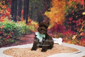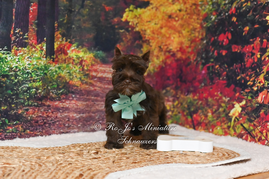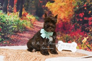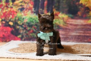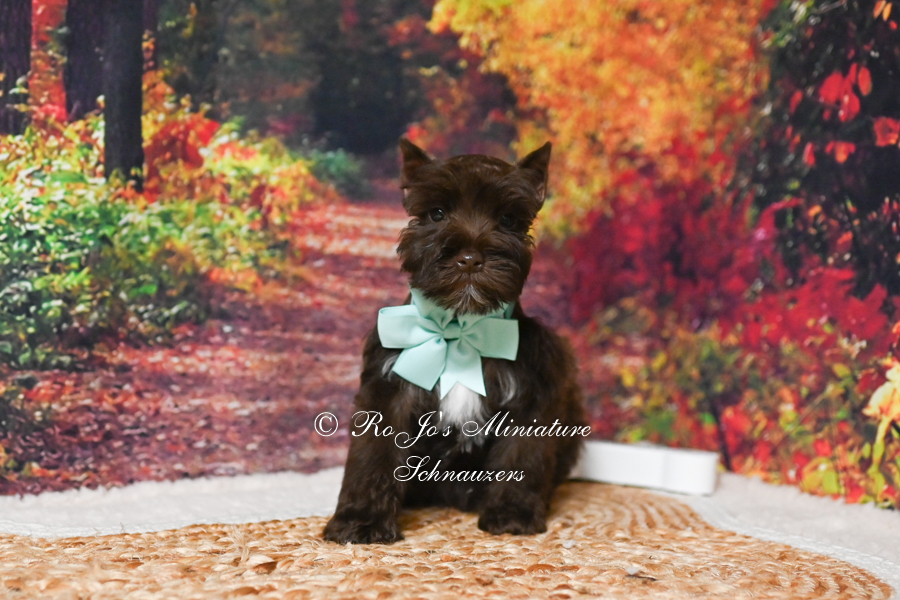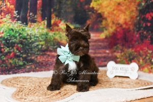 Meet Ginger! She is an adorable liver miniature schnauzer puppy with white markings. With her sweet and loving temperament, she’s the perfect furry friend you’ve been searching for. Bring home the joy! Contact us today!