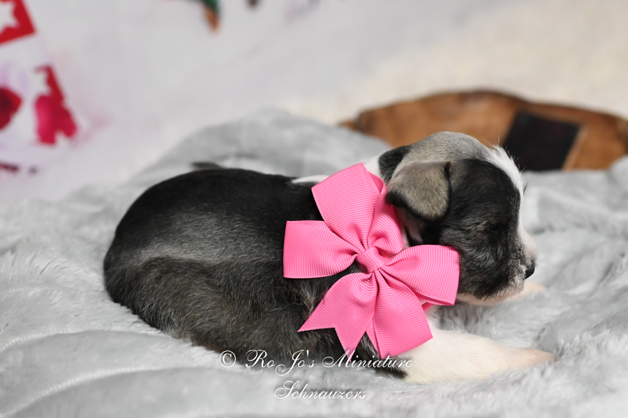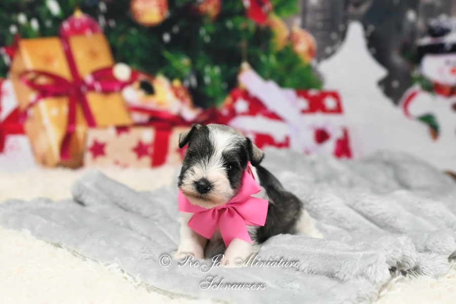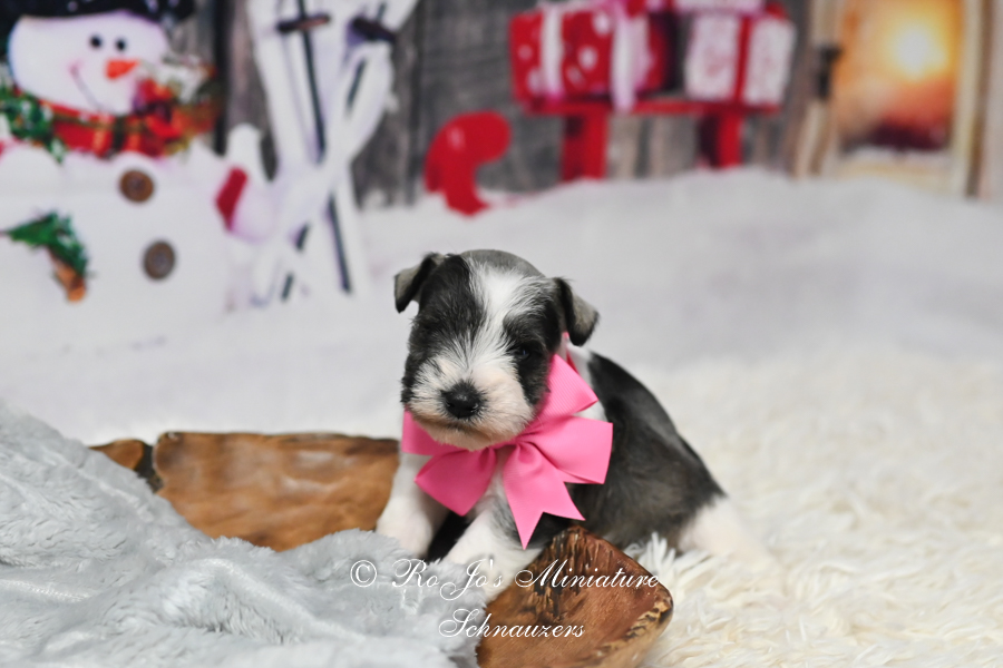 Salt & Pepper Parti Mini Schnauzer Color: Salt & Pepper Parti Gender: Female Date of Birth: 10/17/2025 Sire: Dashing Rhett Dam: Sophisticated Sophie Price: $2000